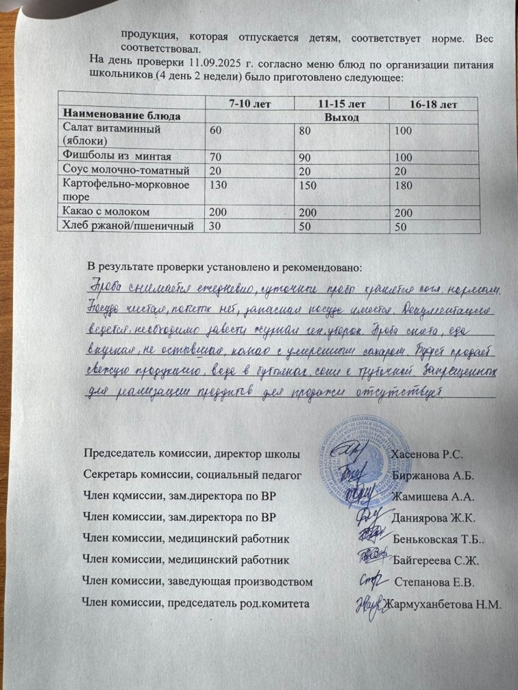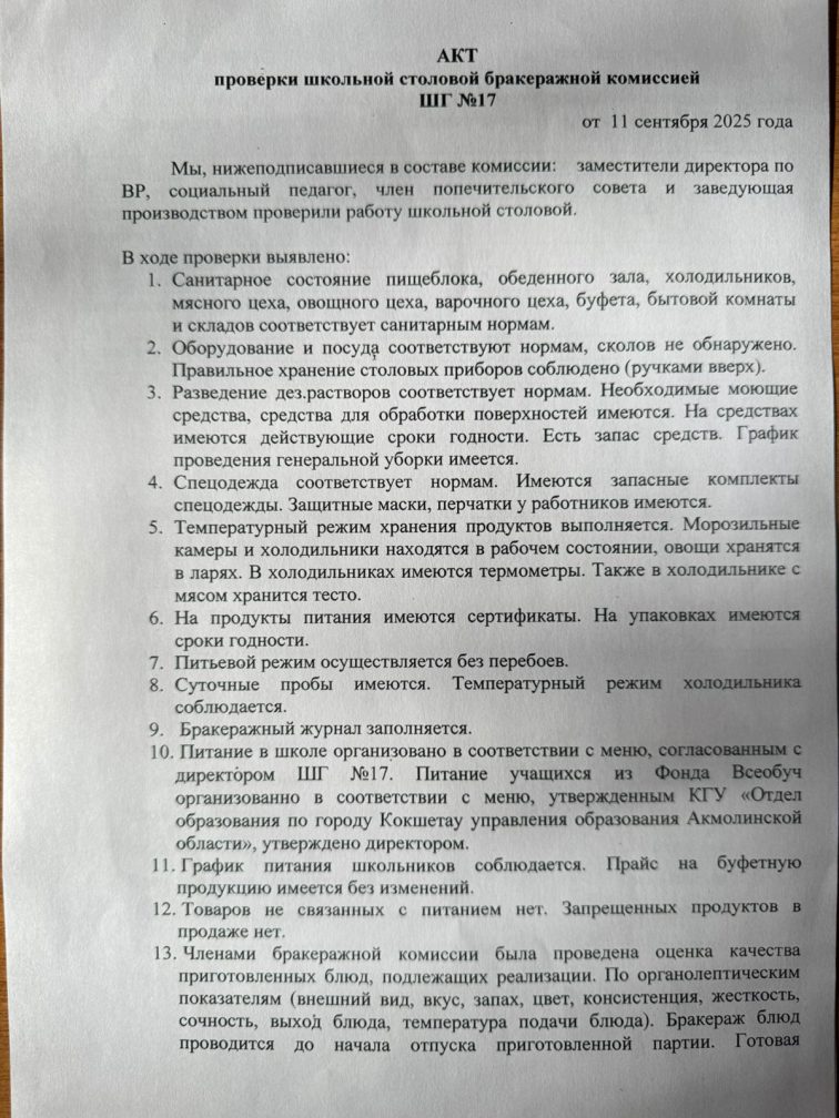 АКТ проверки школьной столовой бракеражной комиссией ШГ №17