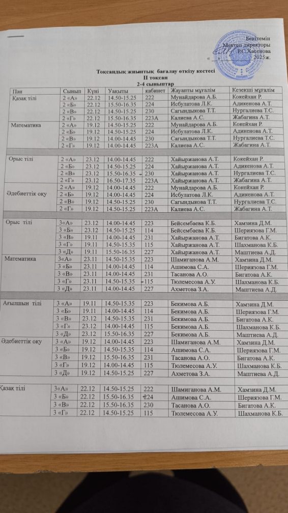 Тоқсандық жиынтық бағалау өткізу кестесі,1-4 сыныптар,2025-2026 оқу жылы