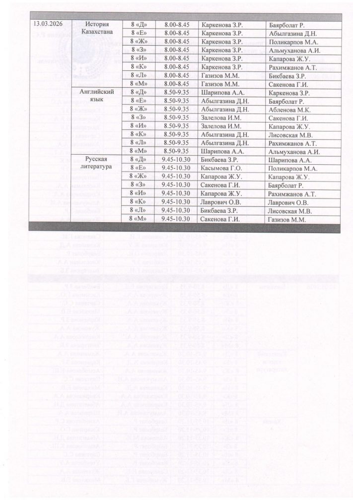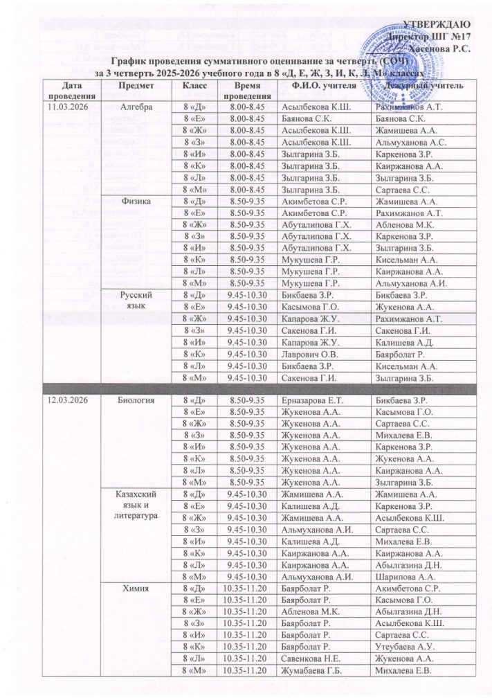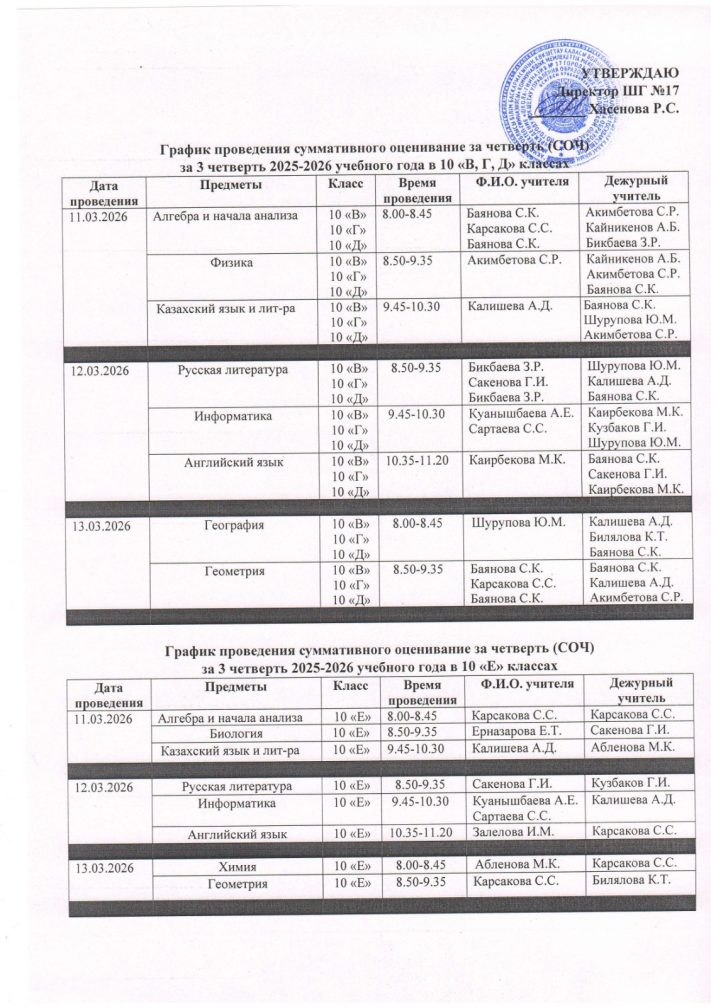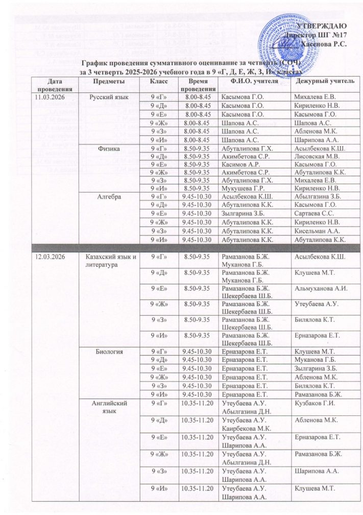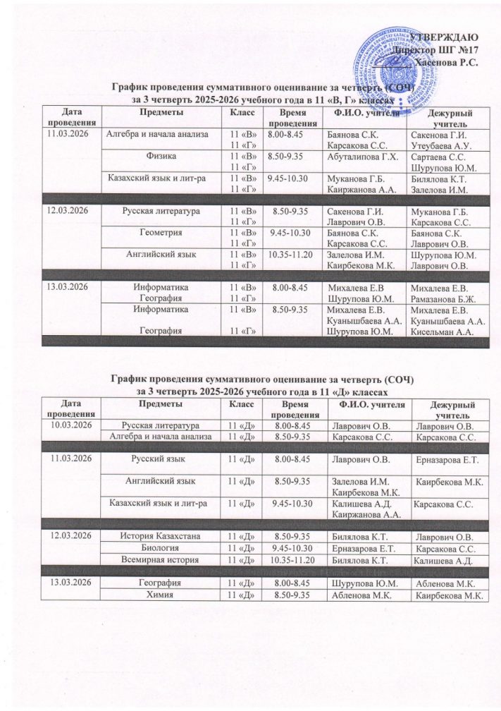График проведения суммативного оценивание за четверть (СОЧ) за 3 четверть 2025-2026 учебного года в 7-11 классах с русским языком обучения (1 смена)