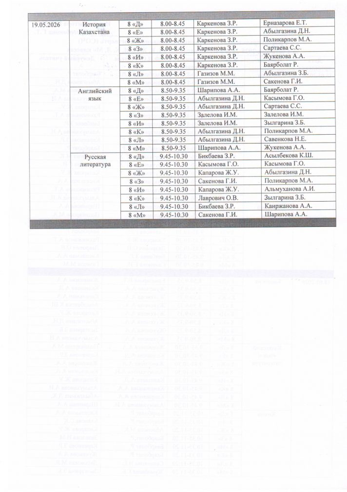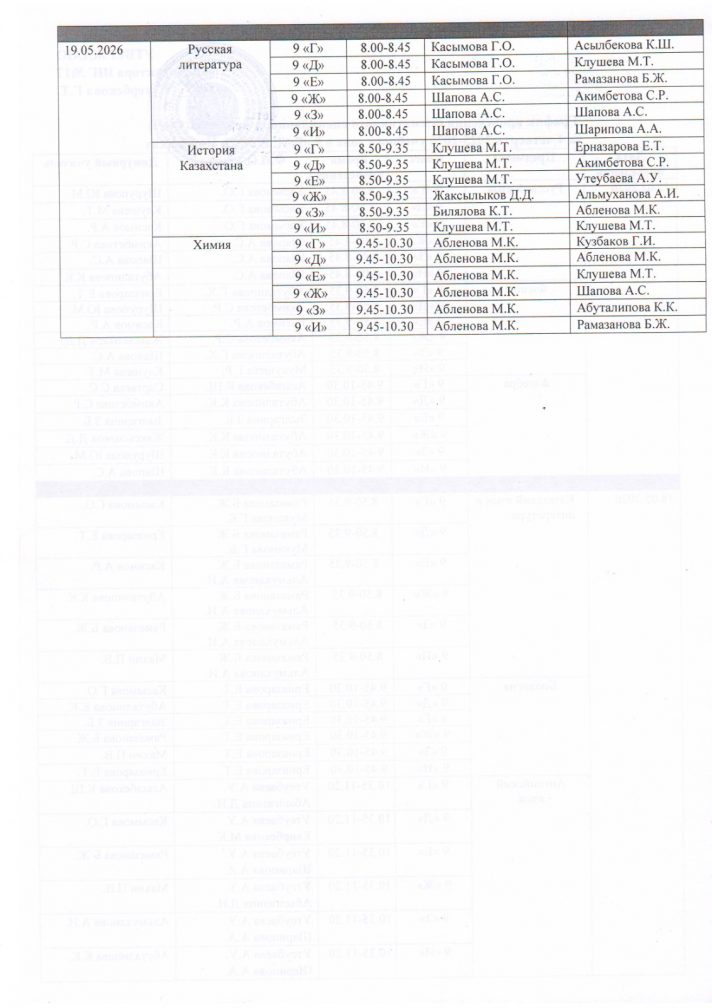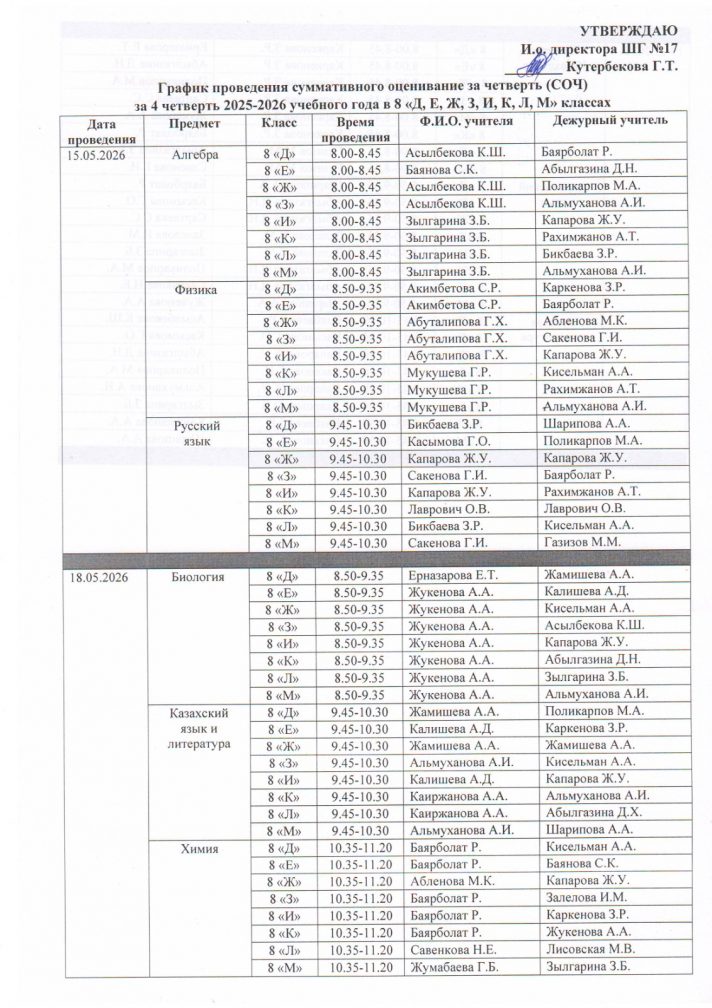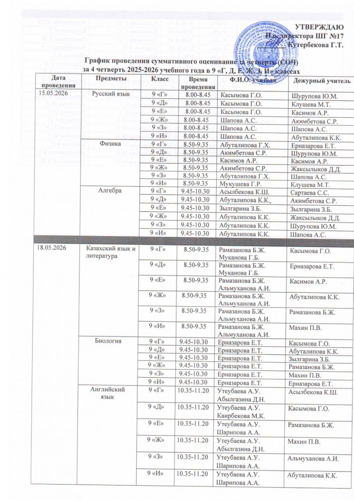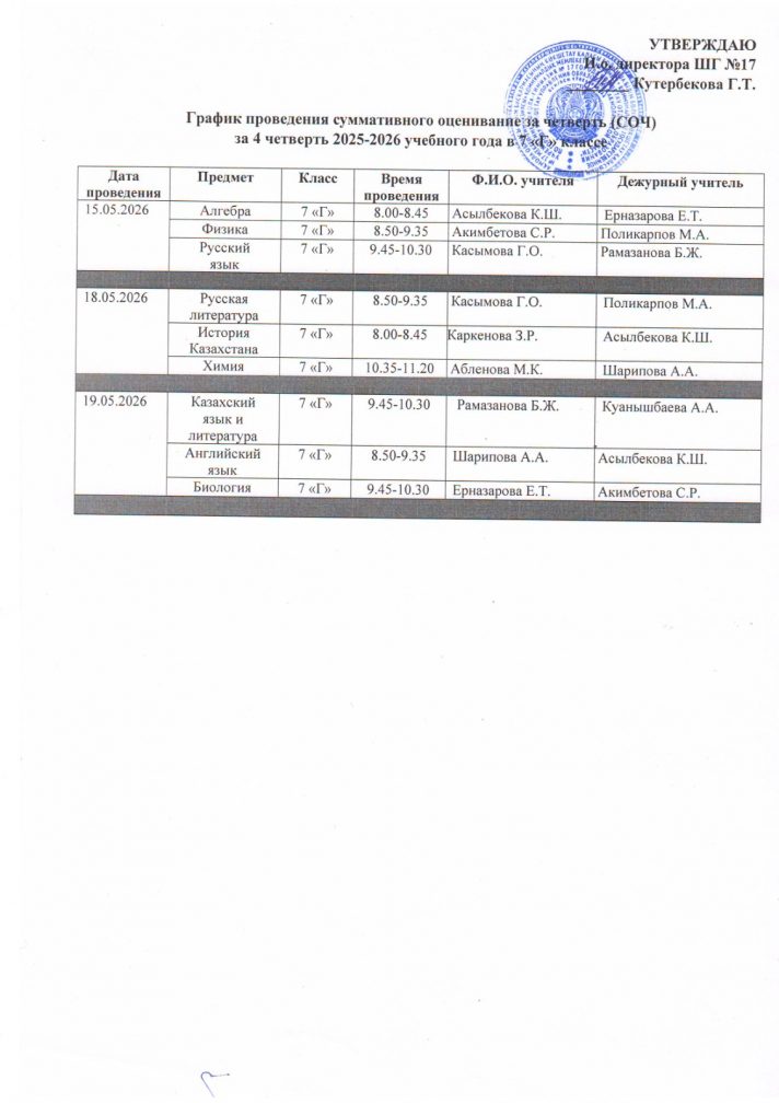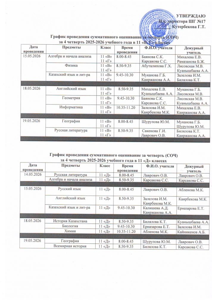 График проведения суммативного оценивание за четверть (СОЧ) за 4 четверть 2025-2026 учебного года в 7-11 классах с русским языком обучения (1 смена)