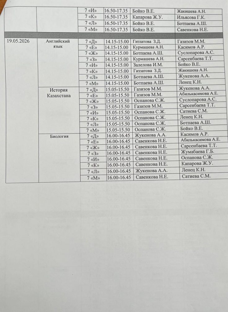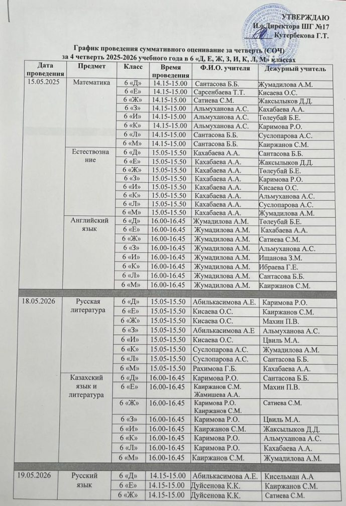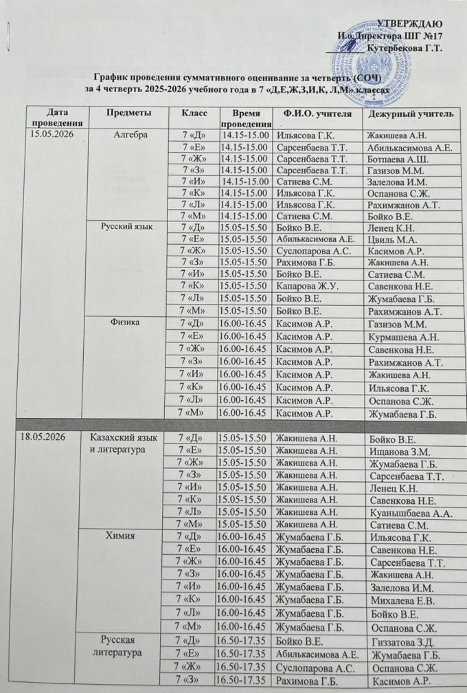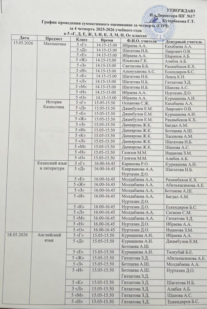 График проведения суммативного оценивание за четверть (СОЧ) за 4 четверть 2025-2026 учебного года в 5-7 классах с русским языком обучения (2 смена)